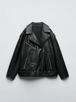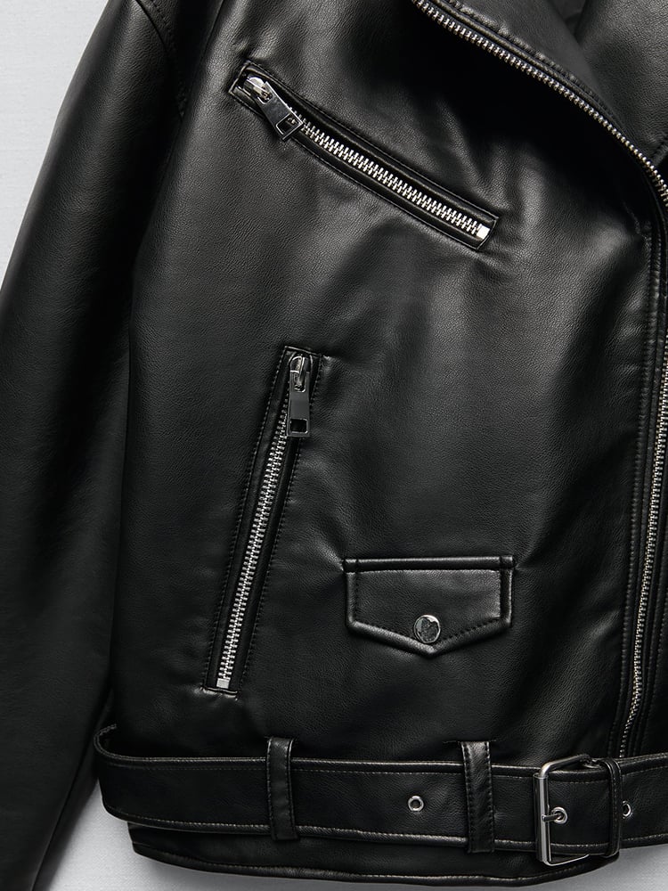 Women Loose Motorcycle Biker Black Pu Faux Leather Jacket with Belt Spring Autumn Female